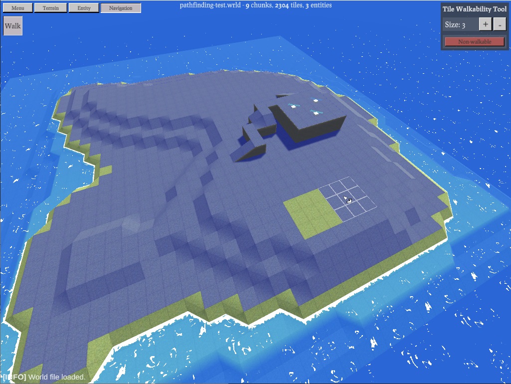 The first thing I did was add a new tool to the editor - the Tile Walkability Tool. I wanted to make it simple for designers to be able to mark tiles as walkable / non-walkable. It's pretty self explanatory, and works like the other tile tools. The editor automatically marks underwater tiles as non-walkable, and I have no plans to add swimming to the game.