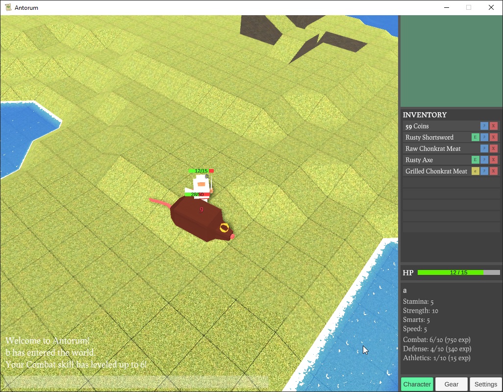 Equipment was a pain. The inventory was already a complex piece of state, and equipment just added more stuff to keep track of. I also had to rework the UI on the client to accomodate this. Now there's a little tabbed menu, with 3 pages: Character, Gear, and Settings. I haven't gotten to make many new models or textures for the equipment yet.