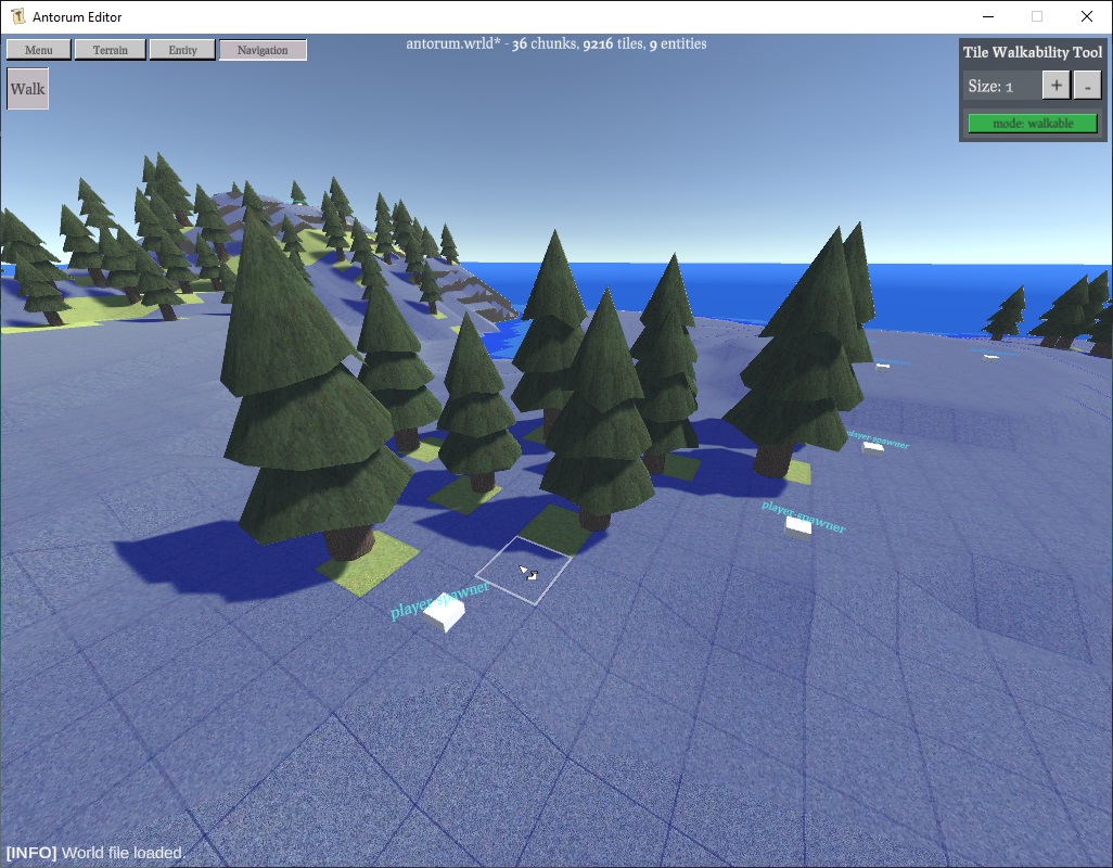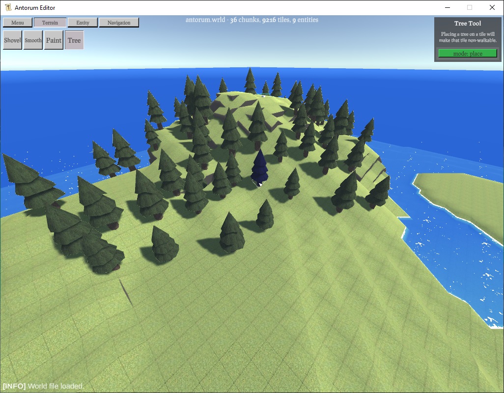 Antorum has trees now! This post is mostly going to be a quick photo overview of those changes, as there isn't much technical stuff to discuss. The editor now has a tree tool, which can be used to quickly place trees (randomizing scale + rotation).
