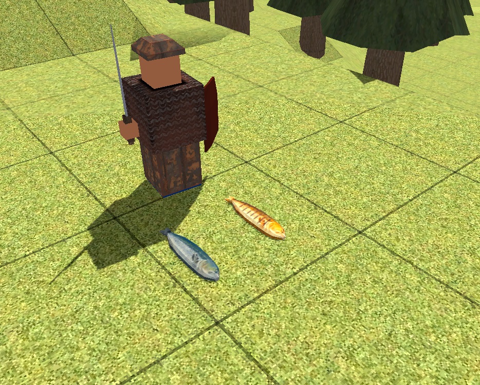 Here's a bonus screenshot, it's a closer view of the first armor set, as well as the model for the Groofish item and it's cooked variant. Obviously I am not an artist by trade but I am having a lot of fun getting some modelling/texturing practice in.