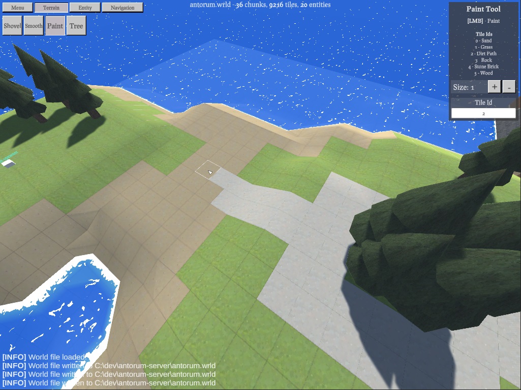 Maps are getting to be way more fun to build. With tile painting, you can make more detailed little mountain bits, bridges, and docks. The map generator will also take care of painting sand on beach areas and underwater (thanks sir!).