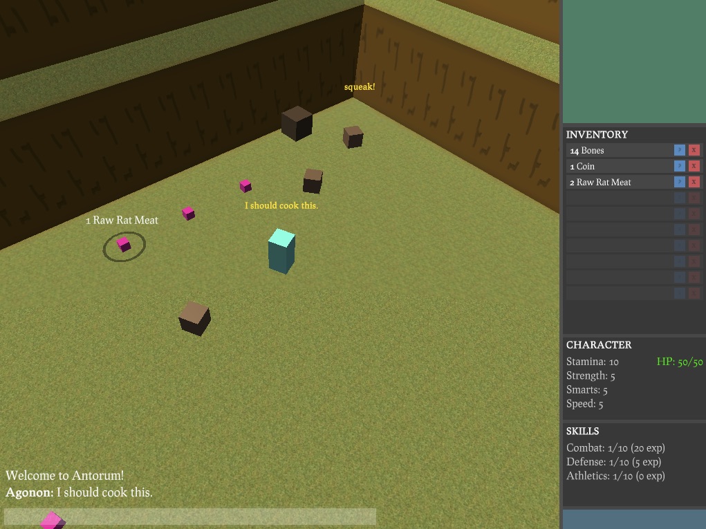 This week I worked on adding items and the inventory to the game. It's not perfect, so I'll probably spend a bit more time tweaking it while I figure out what the next feature is going to be. You can pickup, drop, and examine items. There's no way to trade with other players yet, but one player can drop items for others to pick up. As with the rest of the player data, inventories are stored in the database, and getting that working was one of the most interesting challenges so far. Of all the state in the game, the inventory has the most complex, so it really tested the database and network syncing code. So far it seems to be holding up, but I am getting a lot of insight as to how I plan on designing the codebase for the next multiplayer game I work on. With this update, there are now 24 packets in the game protocol.