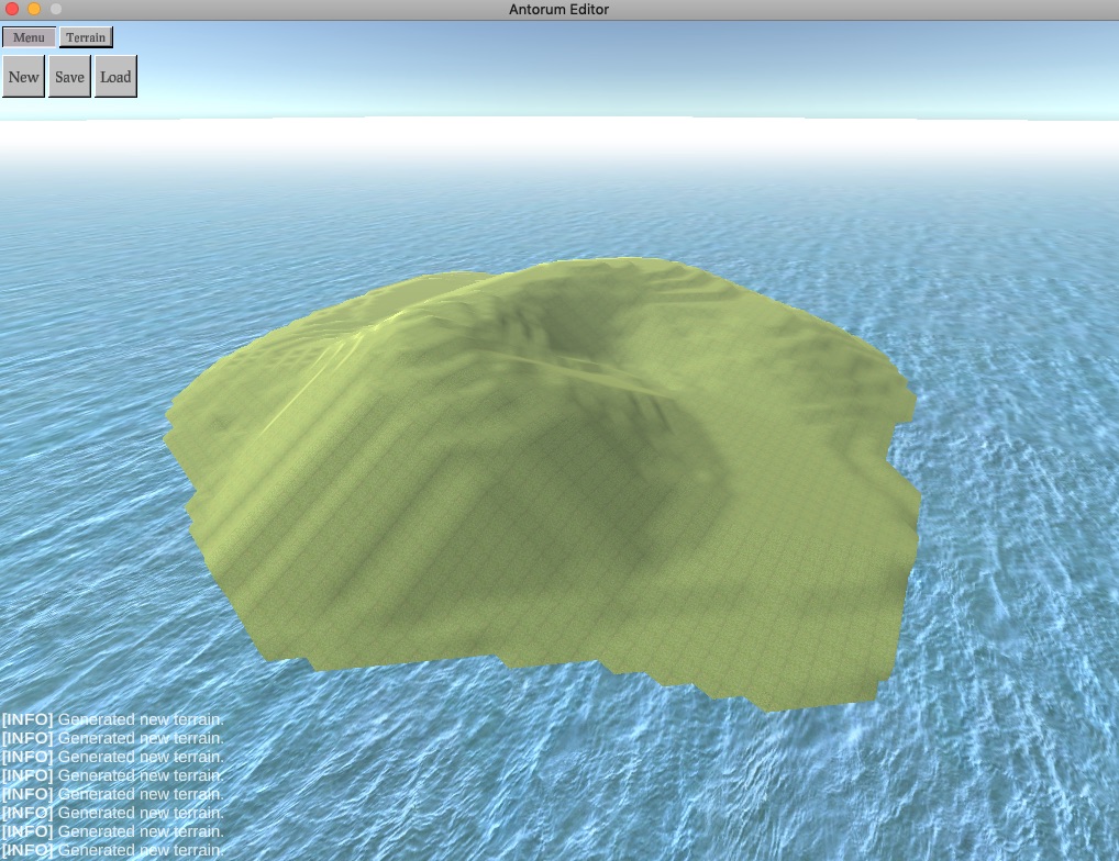 When starting a new terrain, a small primitive island is generated. Eventually, a much larger island would become the base for Antorum. I've tested it on larger sizes and it still runs well, but my current dev machine is a macbook with a very loud fan so I've been keeping the scale down for better performance. I haven't added trees yet.